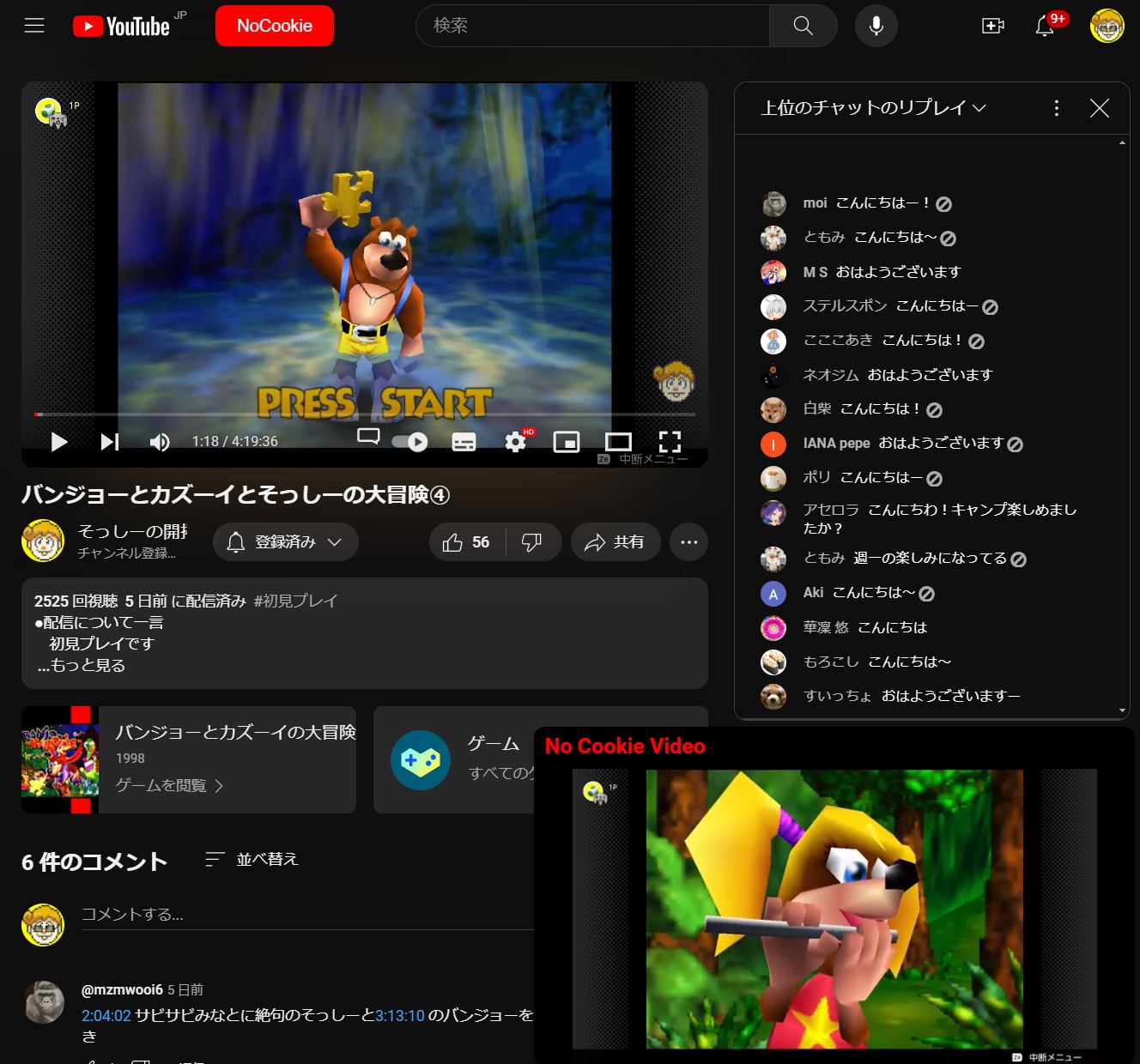 画面上部の「NoCookie」ボタンを押すことで、右下の動画の表示・非表示が切り替え可能です。
